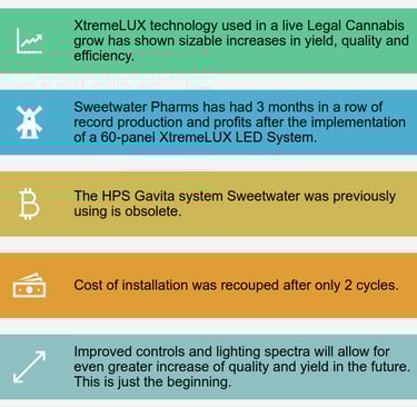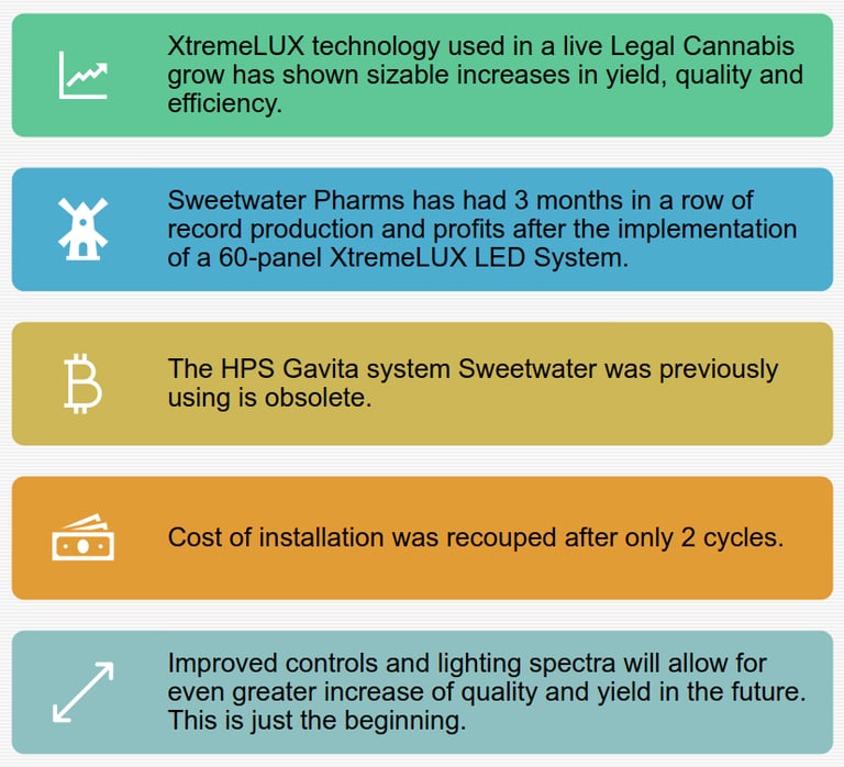 Sweetwater utilized 30 prototype 4x4 ft LED panels from XtremeLUX in a partnership to analyze production for the legal Cannabis industry.